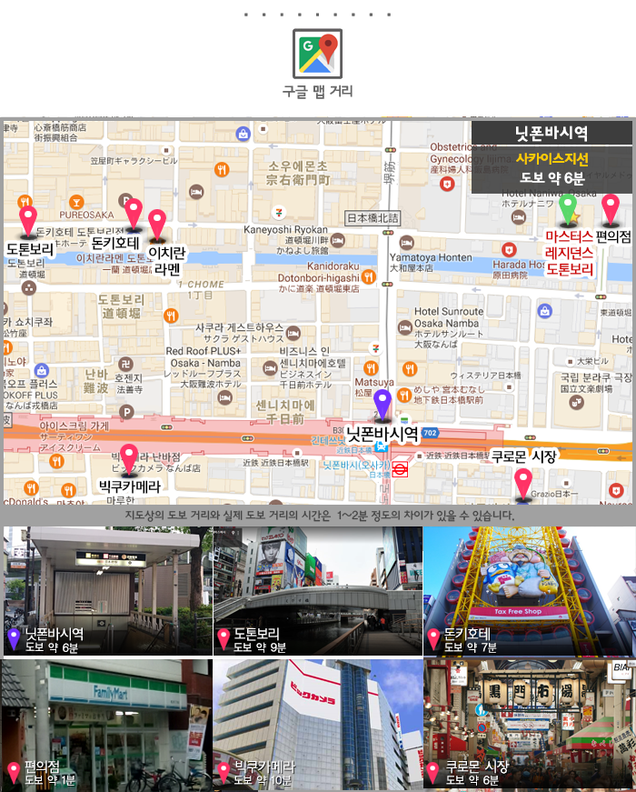 오사카의 주요 관광지이자 번화가인 난바, 신사이바시, 도톤보리, 쿠로몬 시장까지 도보 약 10분 이내로 이동이 가능한 거리에 위치해 있습니다.