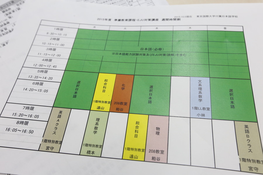 동경국제대학부속 일본어학교의 EJU 과목별 수업표, 담당자, 기간별 학습 내용