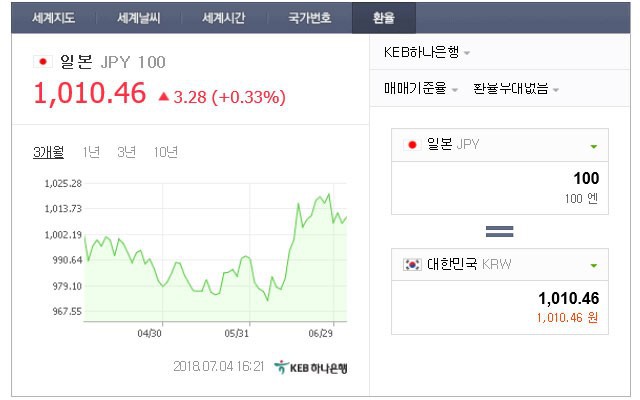 아래는 최근 일본환율의 변화이며 매매기준율을 기준으로 하기때문에 실제 송금을 보내거나 국내에서 학비를 납입하는 경우