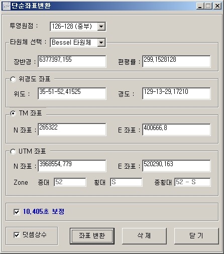 2. TM(동경/중부)로 변환 값을 다시 gtrans를 이용하여 wgs84좌표로 변환 할때 설정부분 입니다.