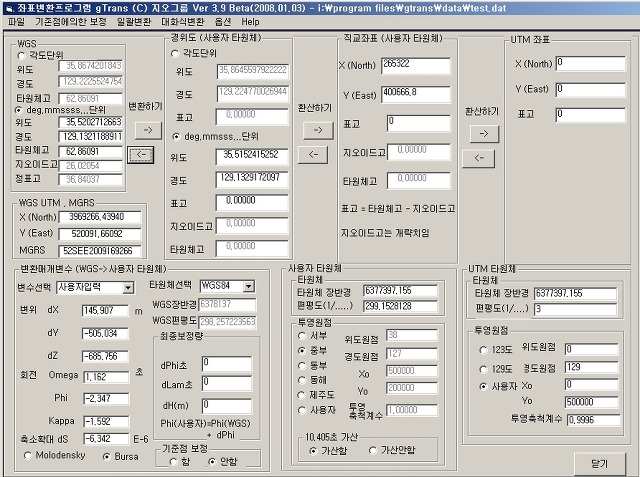 작성자의염산하 작성자 본인 여부 작성자 작성시간 09.05.20 그렇군요, 처음에 URL의 x,y값을 변환프로그램의 x,y에 그대로 넣었더니 엉뚱한 좌표가 나오길래, 바꿔서 넣었더니 얼 추 맞더라구요, 그리고 국토지리정보원의 프로그램은 이래저래 해봐도 잘 않맞더군요...위의 gtrans 이미지 변환값이 어느정도 일치하는 값 결과입니다.
