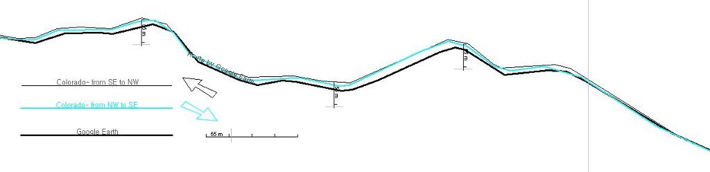 이 그림에서 굵은 검정색 선은 Google Earth 경로며, 가는 검정색 선은 남동 쪽에서 북서 쪽으로 갈 때의 궤적이고, 파란 선은 돌아올 때의 궤적으로 즉 북서에서 남동 쪽으로 갈 때의 궤적입니다. 따라서 가는 파란색 선은 이 그림에서 항시 6~10m 정도 거리를 두고서 아랫 쪽 또는 오른 쪽에 위치해야 맞지요.