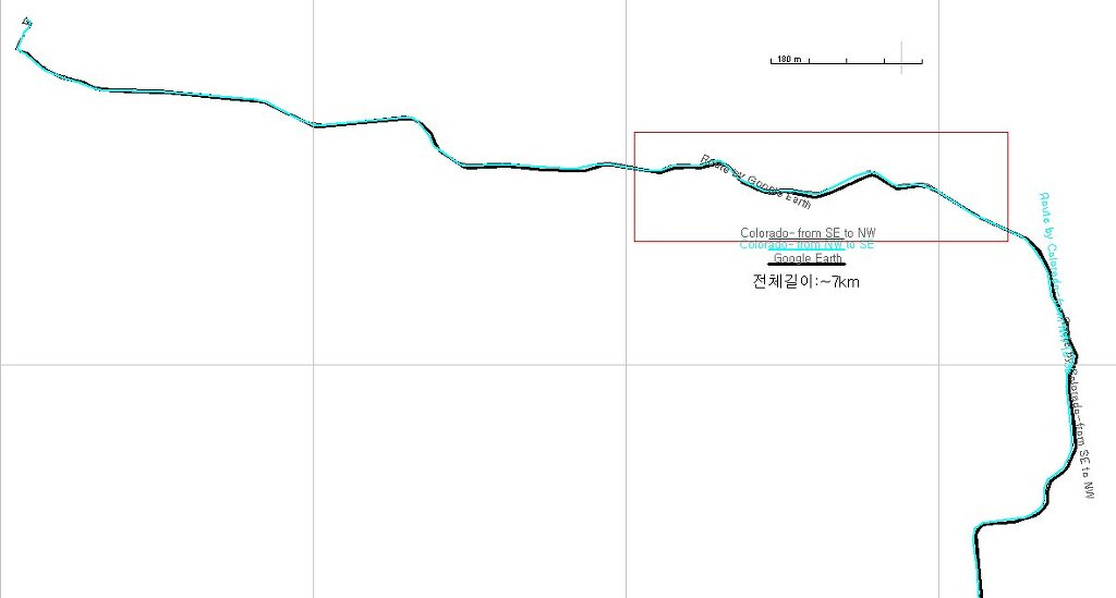 이 그림의 비교에서 보면 전체 길이 7km정도의 구간에서 GPS실궤적과 Googel Earth경로는 대체적으로 서로 일치함 있음을 보이고 있습니다. 그리고 가장 편차가 큰 구간인 빨간 사각형 구간을 확대하면 다음 그림과 같이 됩니다.