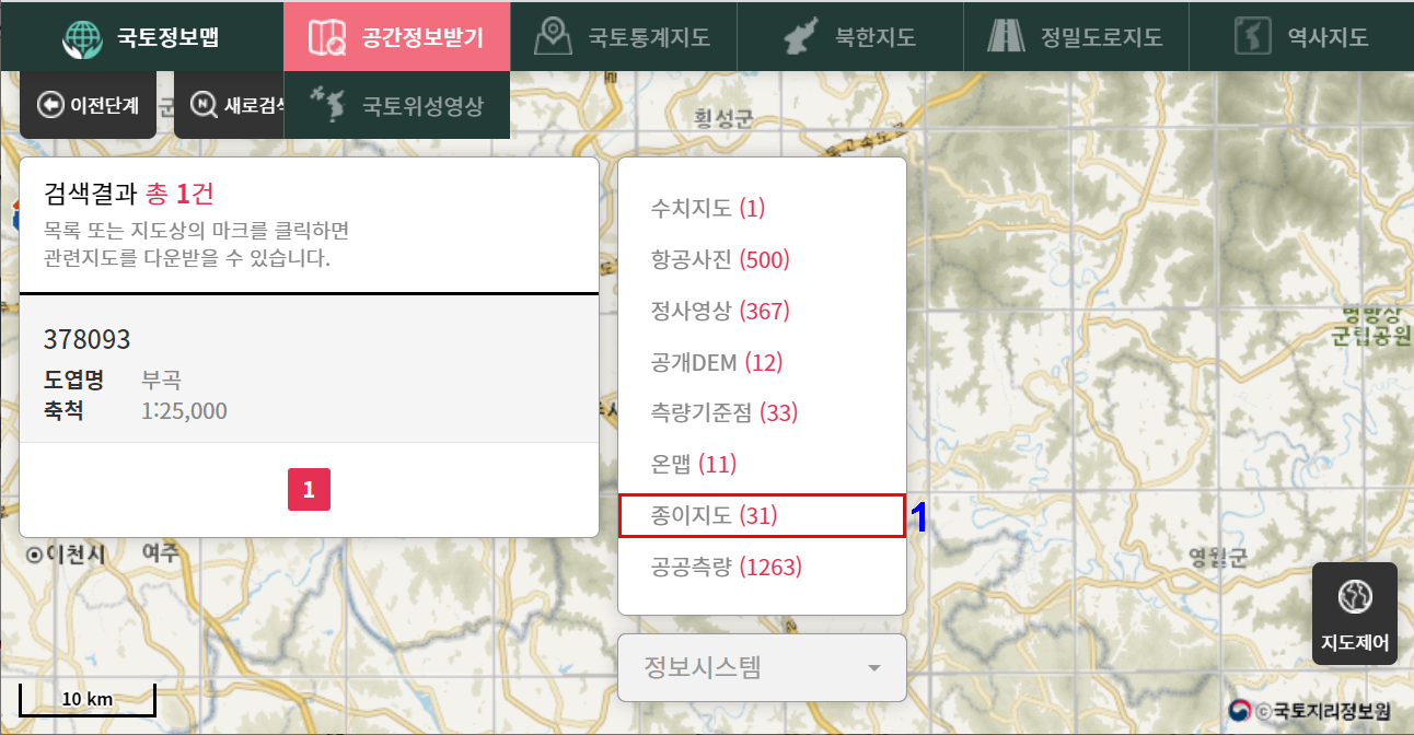 7. 아래 그림의 선택창에서 [종이지도] 항목(1번)을 클릭합니다.