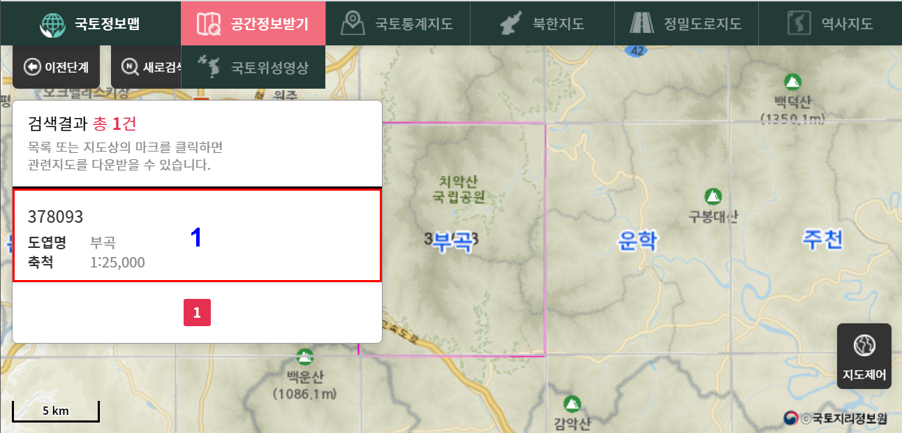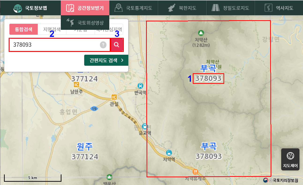 5. 지도를 확대ㆍ축소 및 이동하여 종이 지도로 만들 지역이 나타나게 한 후 종이 지도로 만들 도엽의 번호를 확인합니다. 본 안내문에서는 아래 그림과 같이 치악산이 포함된 378093 도엽(1번)을 선택하겠습니다. 해당 도엽번호를 검색란(2번)에 입력한 후 검색 버튼(3번)을 클릭합니다. 참고로 1:50,000 축척의 도엽번호는 5자리, 1:25,000 축척의 도엽번호는 6자리, 1:5,000 축척의 도엽번호는 8자리, 1:1,000 축척의 도엽번호는 9자리입니다.