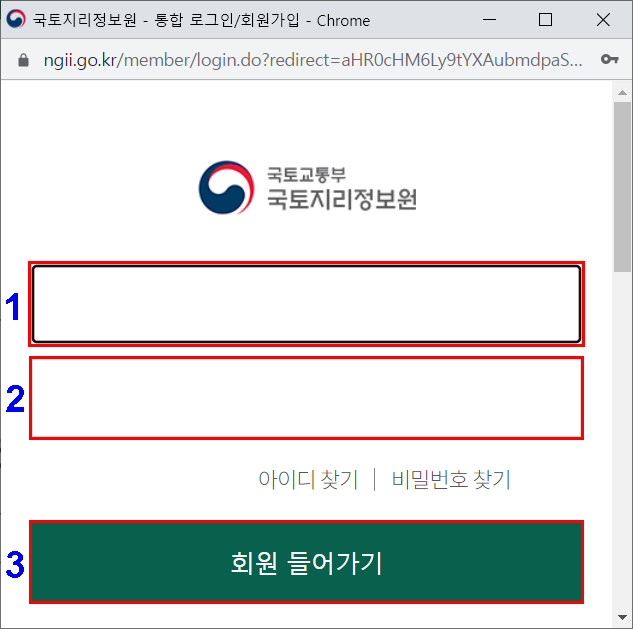 11. 아래 그림의 [통합 로그인/회원가입]창이 열리면 국토지리정보원에 회원가입할 때 등록한 아이디를 아이디란(1번) 입력하고, 회원가입할 때 등록한 비밀번호를 비밀번호란(2번)에 입력합니다. 그런 다음 [회원 들어가기](3번)를 클릭합니다.
