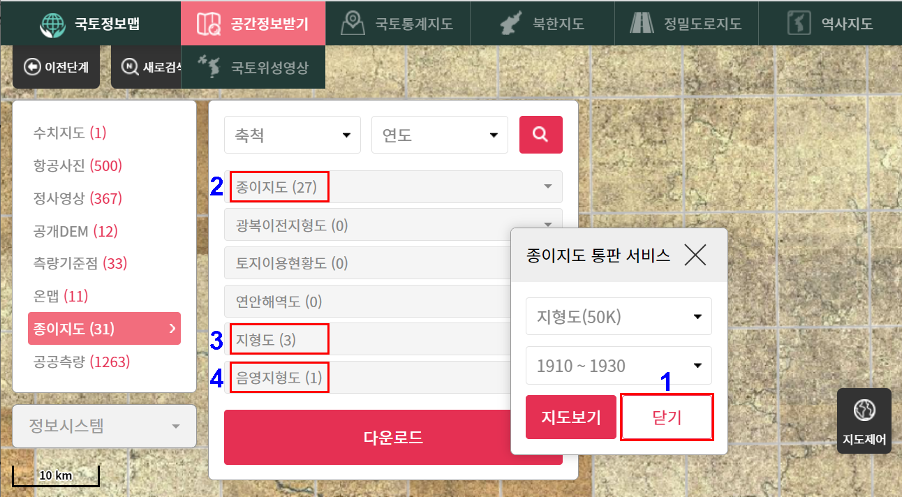 8. 아래 그림의 [종이지도 통판 서비스]창은 본 안내문과 무관한 기능이므로 [닫기](1번)를 클릭하여 해당 창을 닫습니다. 산행에 가장 적합한 종이 지도는 [종이지도](2번), [지형도](3번), [음영지형도](4번)에서 선택하면 됩니다. 각 항목의 괄호 안에 표기된 숫자는 해당 항목 안에 존재하는 하위 항목의 수를 나타냅니다. 하지만 도엽에 따라 모든 항목 안에 하위 항목이 존재하는 것은 아니며 항목 안에 하위 항목이 존재하지 않을 경우 괄호 안에 '0'으로 표기됩니다. 본 안내문에서는 [음영지형도](4번)를 클릭하여 선택하겠습니다.