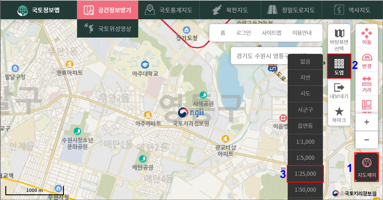 4. 아래 그림과 같이 [통합지도검색]창에서 [지도제어](1번)를 클릭하고, [도엽](2번)을 클릭한 후 종이 지도로 만들 도엽의 [축척](3번)을 선택합니다. 본 안내문에서는 1:25,000 축척을 선택하겠습니다. 이렇게 하면 지도에 도엽의 도곽선들이 나타나지만 더이상 지도의 확대ㆍ축소 및 이동이 안 됩니다. 하지만 [지도제어](1번)를 다시 클릭하여 '지도제어' 글자가 흰색으로 바뀌면 지도의 확대ㆍ축소 및 이동이 가능해집니다.