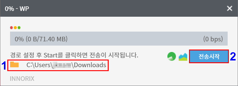 18. 아래 그림의 전송창이 열리면 지도 파일의 저장 경로(1번)가 [다운로드] 폴더임을 표시합니다. [전송시작](2번)을 클릭하면 지도 파일의 전송이 시작되고 전송이 완료되면 해당 창이 사라집니다.