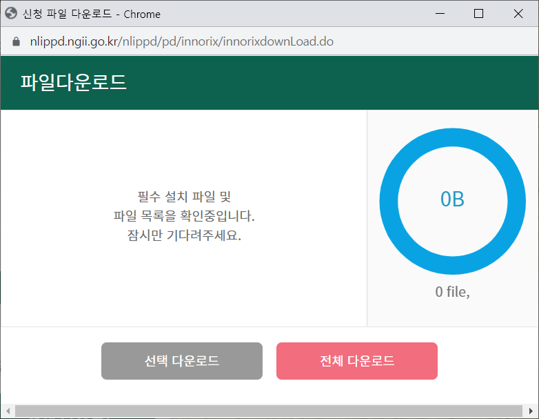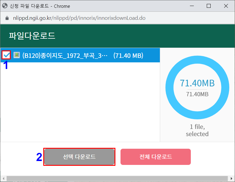 17. 위 14.항에서 16.항까지의 파일 전송 프로그램(INNORIX-Agent) 설치를 완료한 경우 위 9.항에서 12.항의 절차를 다시 수행하면 아래 그림의 [파일다운로드]창이 열립니다. 다운로드할 항목의 선택란(1번)을 클릭하여 체크 표시(✔)를 한 후 [선택 다운로드](2번)를 클릭합니다.