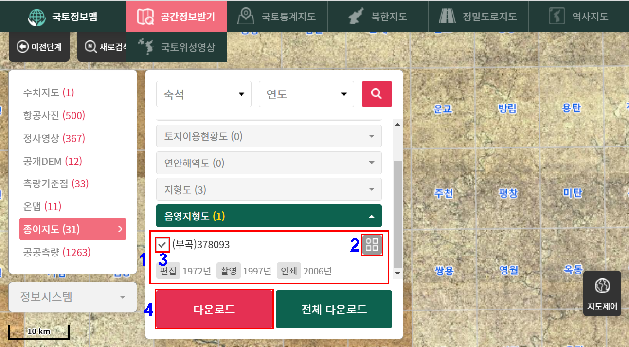 9. 아래 그림에서 [음영지형도] 항목의 하위 항목 한 개(1번)를 볼 수 있으며 해당 하위 항목의 [메타정보](2번)를 클릭하면 도엽의 개략적인 이미지를 미리보기할 수 있습니다. 해당 하위 항목의 선택란(3번)을 클릭하여 체크 표시(✔)를 한 후 [다운로드](4번)를 클릭합니다.