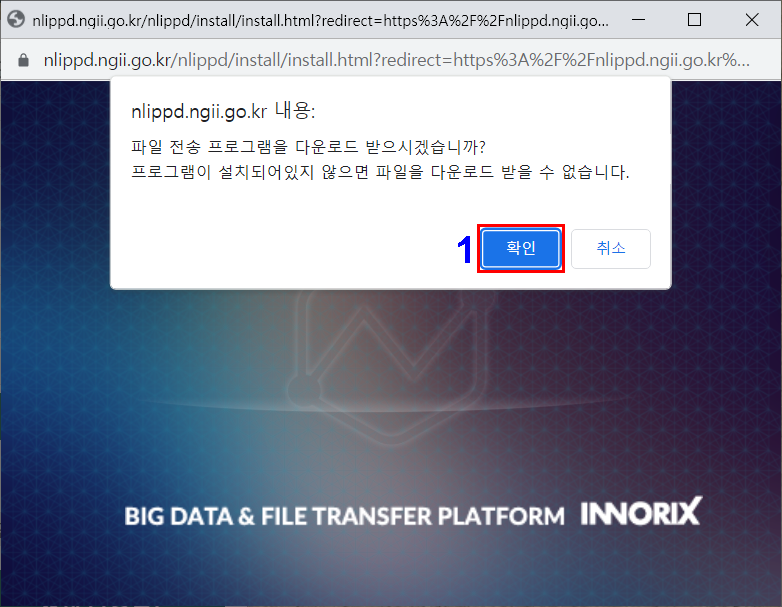 14. 만약 처음으로 지도 파일을 다운로드하는 경우 위 그림의 [파일다운로드]창이 곧 닫히고 아래 그림의 파일 전송 프로그램 설치를 안내하는 창이 열립니다. 그러면 [확인](1번)을 클릭합니다.