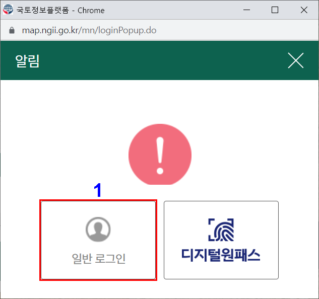 10. 아래 그림의 [알림]창이 열리면 [일반 로그인]을 클릭합니다.