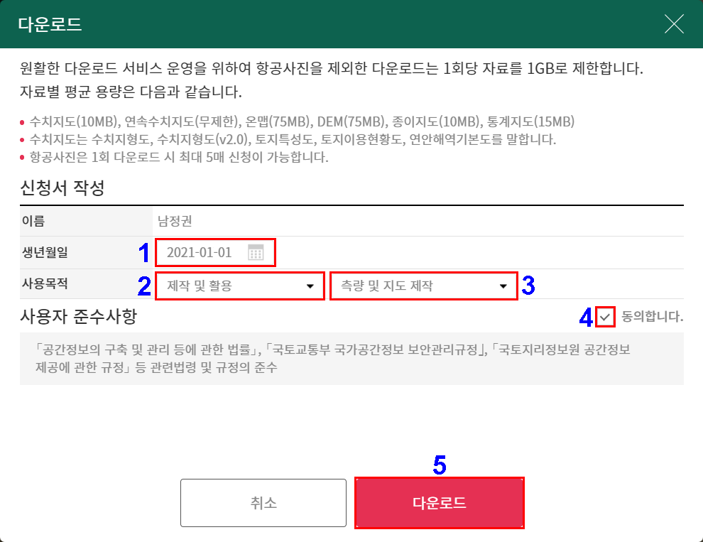 12. 아래 그림의 [다운로드]창이 열리면 [생년월일](1번)에 자신의 생년월일을 입력해야 하지만 현재 시스템 오류로 인해 2021년 1월 1일 이전의 날짜를 입력할 수 없습니다. 따라서 그냥 임의로 생년월일을 선택합니다. 그리고 [사용목적]의 [대분류](2번)와 [소분류](3번)는 아래 그림과 같이 선택합니다. 그런 다음 동의란(4번)을 클릭하여 체크 표시(✔)를 한 후 [다운로드](5번)를 클릭합니다.