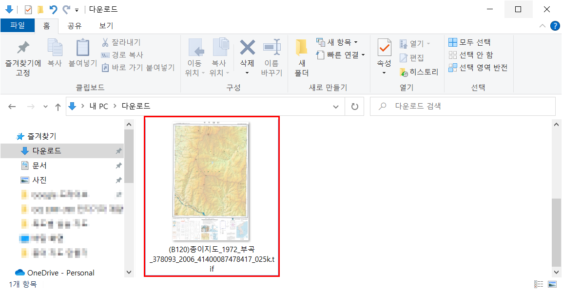 19. PC의 [파일 탐색기]를 실행하여 [다운로드] 폴더를 열어 보면 아래 그림과 같이 1:25,000 축척의 도엽(도엽번호 378093) 전체 이미지가 TIF 형식의 파일로 다운로드된 것을 확인할 수 있습니다.