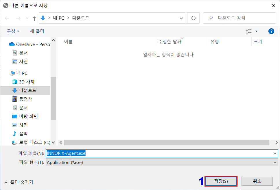 15. 아래 그림의 [다른 이름으로 저장]창이 열리면 다운로드할 위치를 지정한 후 하단의 [저장(S)](1번)을 클릭하여 설치 파일(INNORIX-Agent.exe)을 PC에 다운로드합니다.