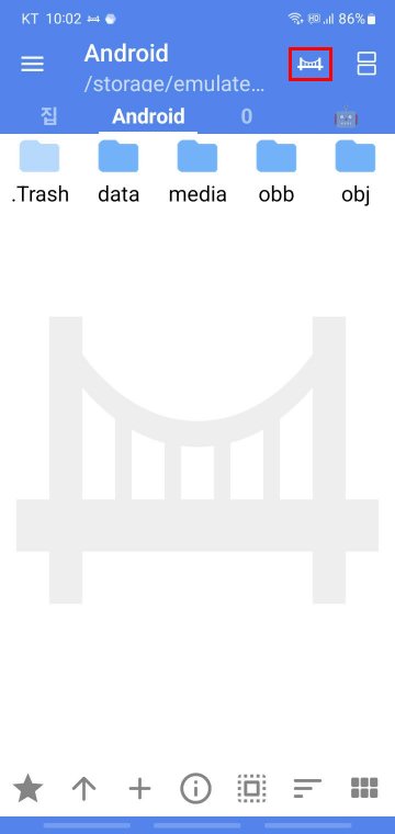 1. 아래 그림과 같이 [FV File Manager] 앱 화면 상단에 교량 모양의 아이콘이 있을 경우에만 해당 아이콘을 터치 ➤ 물음창이 열리면 [출구]를 터치합니다.