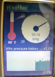 From any screen press MENU, “Weather”, and press ENTER. The Weather Screen is displayed with the current temperature and barometer information. Temperature and barometric information are displayed in a familiar and easy to read format. The bottom of the display is a graphic of the barometric readings taken over the last 48 hours. (The Color will take barometric readings anytime the unit is active.)