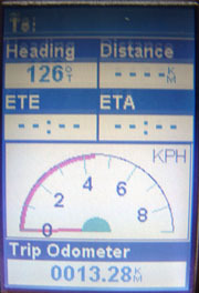 This unique screen shows your current speed and other data. A second larger RED arc appears when under way, which is your average speed since the unit gained lock. Once your speed increases, the scale of the speedometer increases automatically.