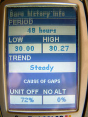 A new bar indicating the barometric pressure is added to the graph once every 15 minutes. If during the course of an hour it has taken two readings, it fills in the gap between the readings. If, however, the receiver has been turned off, or it does do not have enough satellites to compute altitude (four satellites are needed for altitude computations), and only one reading or less has been taken in the course of the last hour, there will be gaps in the chart.