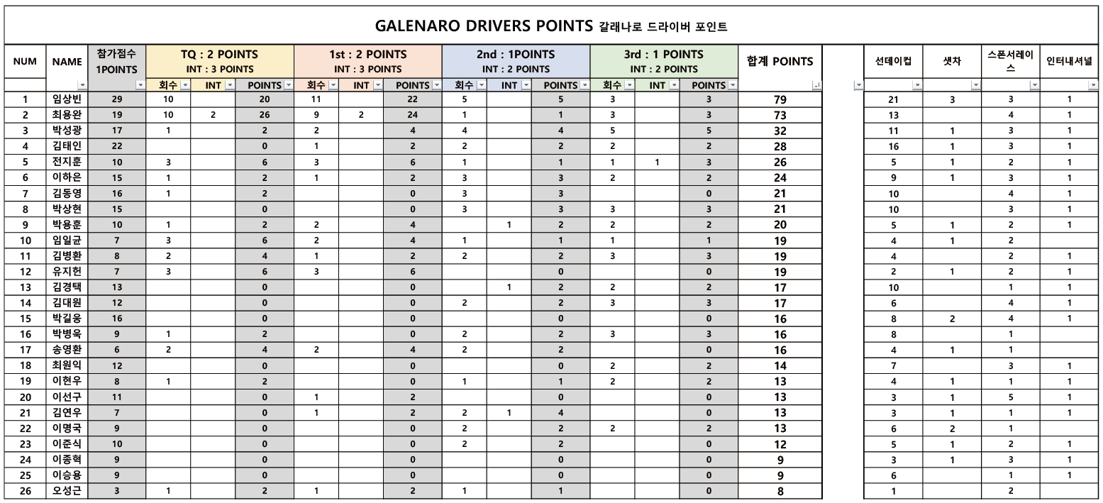 2025년 11월 16일 기준 선데이컵 레이스 어워즈와 갈래나로 드라이버 레이스포인트 입니다 작성자김윤탁|작성시간25.11.21|조회수231 목록 댓글 0 글자크기 작게가 글자크기 크게가 다음검색 현재 게시글 추가 기능 열기 북마크 공유하기 신고 센터로 신고 댓글 댓글 0 댓글쓰기 답글쓰기 댓글 리스트