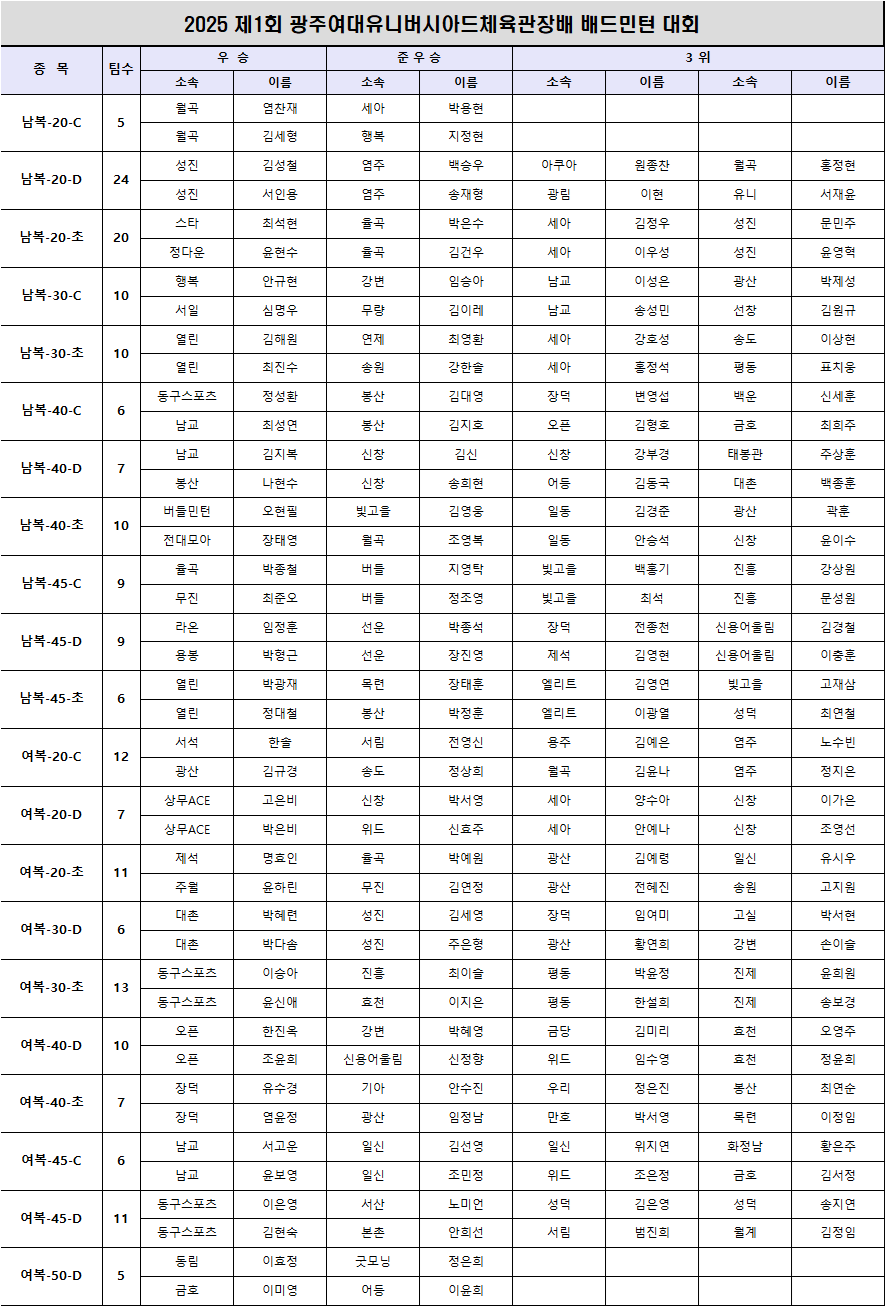 제1회 광주유니버시아드체육관장배 입상자 명단 작성자총무(박소원)|작성시간25.11.17|조회수346 목록 댓글 1 글자크기 작게가 글자크기 크게가 입상자 명단.xlsx15.52KB 첨부파일첨부된 파일이 2개 있습니다. png 파일 제목 없음.png 다운로드 xlsx 파일 입상자 명단.xlsx 다운로드 다음검색 현재 게시글 추가 기능 열기 북마크 공유하기 신고 센터로 신고 댓글 댓글 1 댓글쓰기 답글쓰기 댓글 리스트 작성자총무(박소원) 작성자 본인 여부 작성자 | 작성시간 25.11.17 승급처리는 시협회에서 타대회 결과를 종합하여, 적용됩니다. 댓글 전체보기