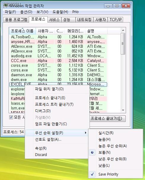 원하는 프로그램에 대고 마우스 오른쪽을 클릭하면 우선순위를 설정할 수 있는 메뉴가 뜨구요. 기존과는 다르게 Save Priority 가 추가되어 있습니다.처음 한번만 설정해주면 같은 프로그램을 또 띄웠을 때 알아서 기존에 설정한 우선순위로 고정되어 실행이 됩니다.