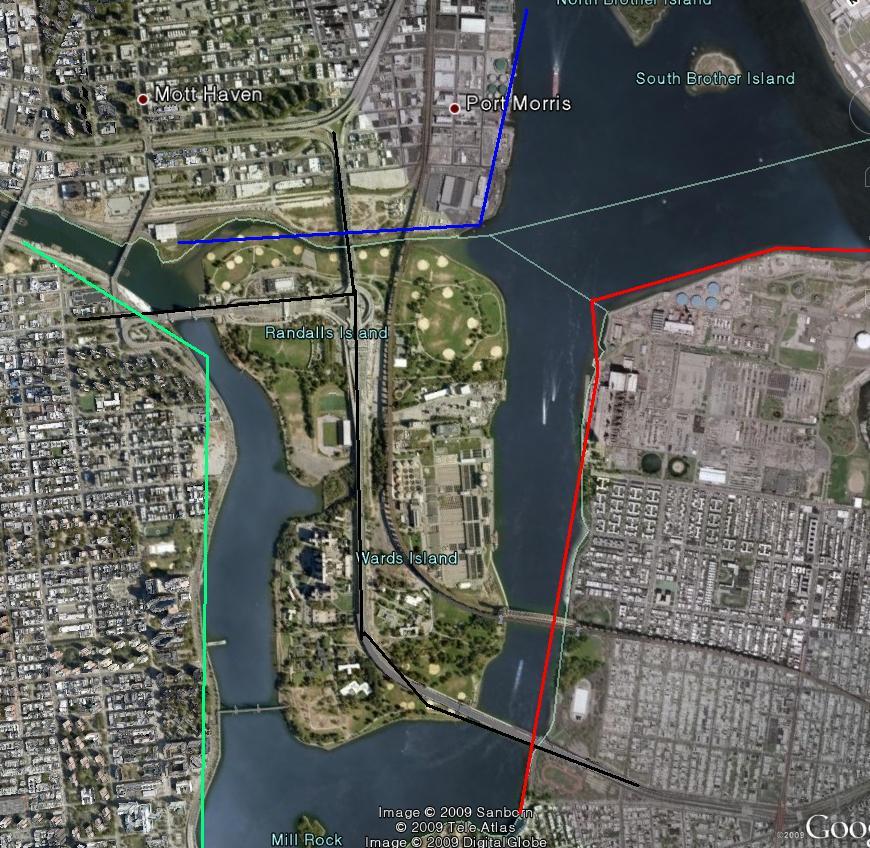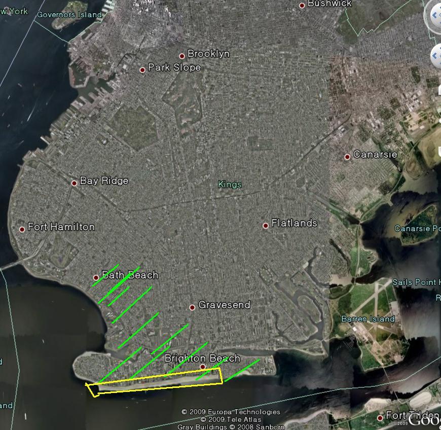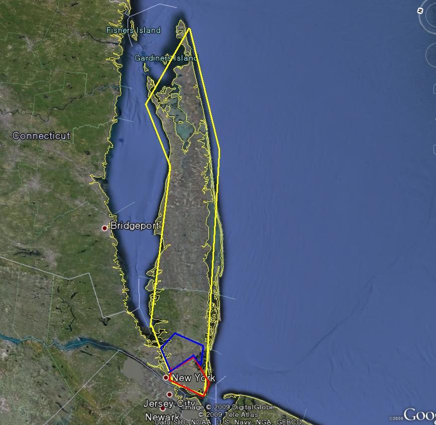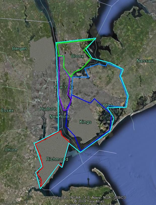 붉은 색이 브룩클린 구, 푸른색이 퀸즈 구, 그리고 노랑색이 롱 아일랜드입니다.