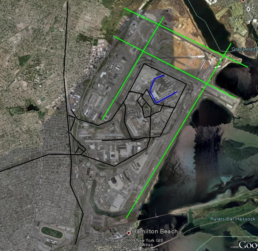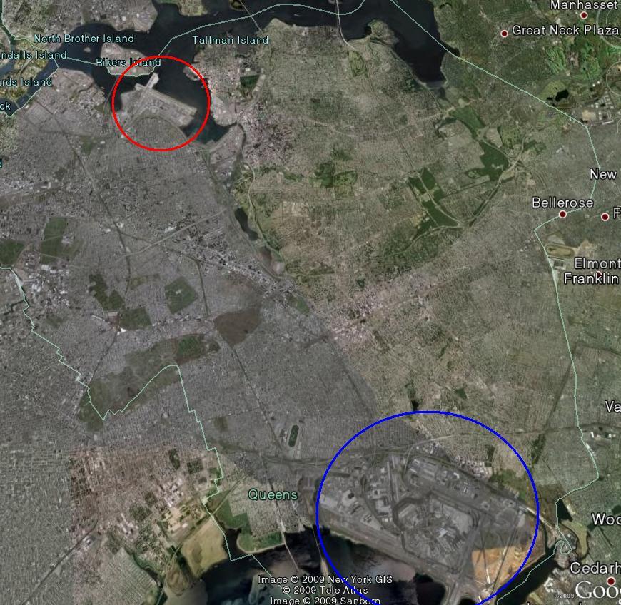 푸른색 원 안의 커다란 공항은 존 F 케네디 국제공항입니다.