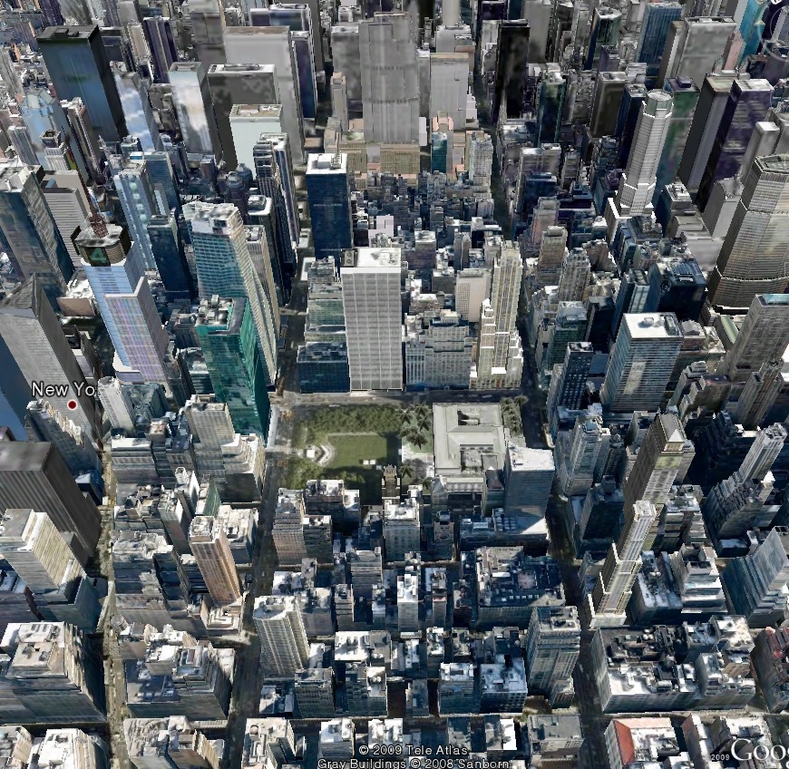 중간의 녹색공원은 뉴욕 시립도서관입니다.