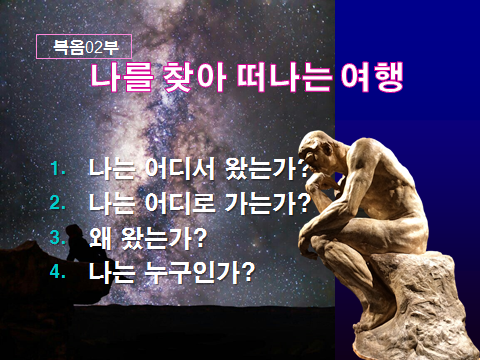 이 세상의 가장 중요한 발견중의 하나는 나를 찾는 것입니다. 이전에 내 가슴을 두드렸던, 내가 어디서 와서 어디로 가는 지 왜 사는지 그 소중한 물음을 다시 만나보세요.