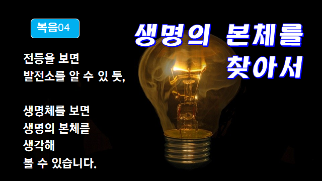 전구를 보면 보이지 않아도 발전소가 있음을 알수 있듯, 생명체를 보면 생기를 주관하는 생명의 본체가 되시는 절대자가 계심을 알 수 있습니다. 생명의 본체와의 접촉으로 생명과 감동이 충만한 생애 누려보세요.