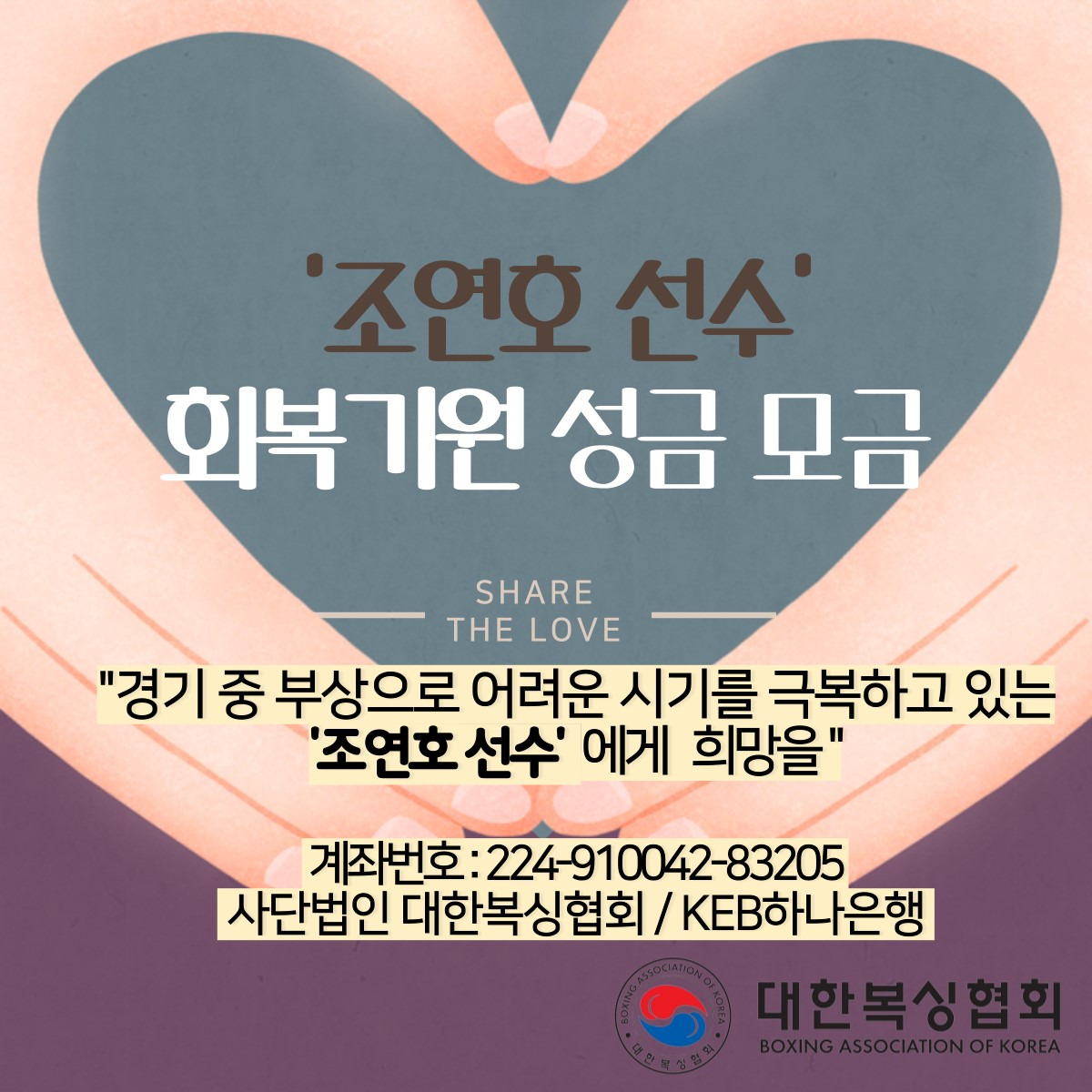 조연호 선수 성금 모금 협조 요청 작성자경기도복싱협회|작성시간25.10.24|조회수169 목록 댓글 0 글자크기 작게가 글자크기 크게가 조연호 선수 성금 모금 협조 요청.pdf41.93KB조연호 선수의 빠른 회복을 기원하며 성금을 모금하고 있습니다.여러분의 따뜻한 관심과 격려가 큰 힘이 됩니다.많은 참여와 응원을 부탁드립니다.감사합니다. (경기도복싱협회) 첨부파일첨부된 파일이 2개 있습니다. jpg 파일 사본 -조연호.jpg 다운로드 pdf 파일 조연호 선수 성금 모금 협조 요청.pdf 다운로드 다음검색 현재 게시글 추가 기능 열기 북마크 공유하기 신고 센터로 신고 댓글 댓글 0 댓글쓰기 답글쓰기 댓글 리스트
