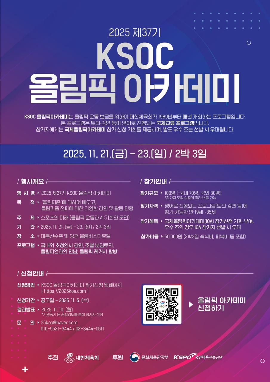 1. 관련: 대한체육회 국제교류부-6138(2025.10.23.)「2025년 제37기 KSOC 올림픽아카데미 참가신청 안내 및 협조요청」