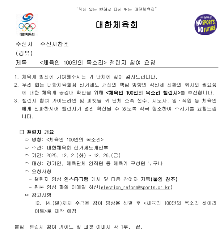 체육인 100인의 목소리 챌린지 참여 요청 작성자경기도복싱협회|작성시간25.12.04|조회수35 목록 댓글 0 글자크기 작게가 글자크기 크게가 대한체육회에서 <체육인 100인의 목소리 챌린지 참여 요청> 공문이 내려와 내용 공유드립니다. (공문) 체육인 100인의 목소리 챌린지 참여 요청.pdf87.23KB체육인 100인의 목소리 챌린지 참여 가이드.hwp125.50KB체육인 100인의 목소리 챌린지 참여 요청.pdf128.03KB체육인 100인의 목소리 피켓.png533.39KB 첨부파일첨부된 파일이 5개 있습니다. png 파일 image.png 다운로드 pdf 파일 (공문) 체육인 100인의 목소리 챌린지 참여 요청.pdf 다운로드 hwp 파일 체육인 100인의 목소리 챌린지 참여 가이드.hwp 다운로드 pdf 파일 체육인 100인의 목소리 챌린지 참여 요청.pdf 다운로드 png 파일 체육인 100인의 목소리 피켓.png 다운로드 다음검색 현재 게시글 추가 기능 열기 북마크 공유하기 신고 센터로 신고 댓글 댓글 0 댓글쓰기 답글쓰기 댓글 리스트