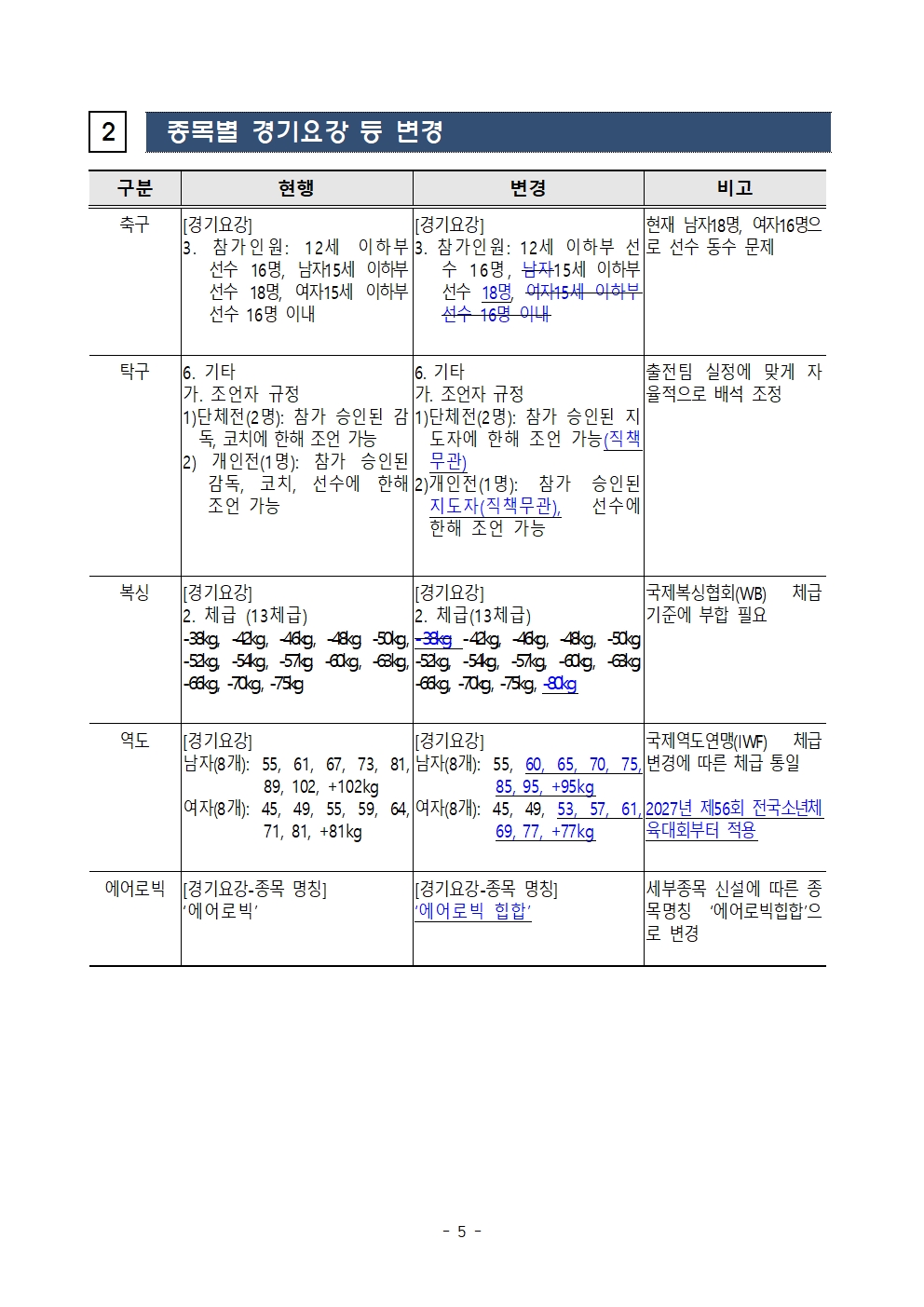 2026년도 전국종합체육대회(전국소년체육대회) 변경사항 알림 작성자경기도복싱협회|작성시간26.01.06|조회수614 목록 댓글 0 글자크기 작게가 글자크기 크게가 2026년도 전국종합체육대회(전국소년체육대회) 복싱종목 변경사항입니다.자세한 내용은 첨부자료를 확인하여 주시기 바랍니다.(공문)2026년도 전국종합체육대회(전국생활체육대축전, 전국소년체육대회) 변경사항 알림 (1).pdf123.87KB★2026년도 전국종합체육대회 변경사항(대축전, 소년체전)_공지 (2)005.jpg472.67KB 첨부파일첨부된 파일이 3개 있습니다. png 파일 image.png 다운로드 pdf 파일 (공문)2026년도 전국종합체육대회(전국생활체육대축전, 전국소년체육대회) 변경사항 알림 (1).pdf 다운로드 jpg 파일 ★2026년도 전국종합체육대회 변경사항(대축전, 소년체전)_공지 (2)005.jpg 다운로드 다음검색 현재 게시글 추가 기능 열기 북마크 공유하기 신고 센터로 신고 댓글 댓글 0 댓글쓰기 답글쓰기 댓글 리스트