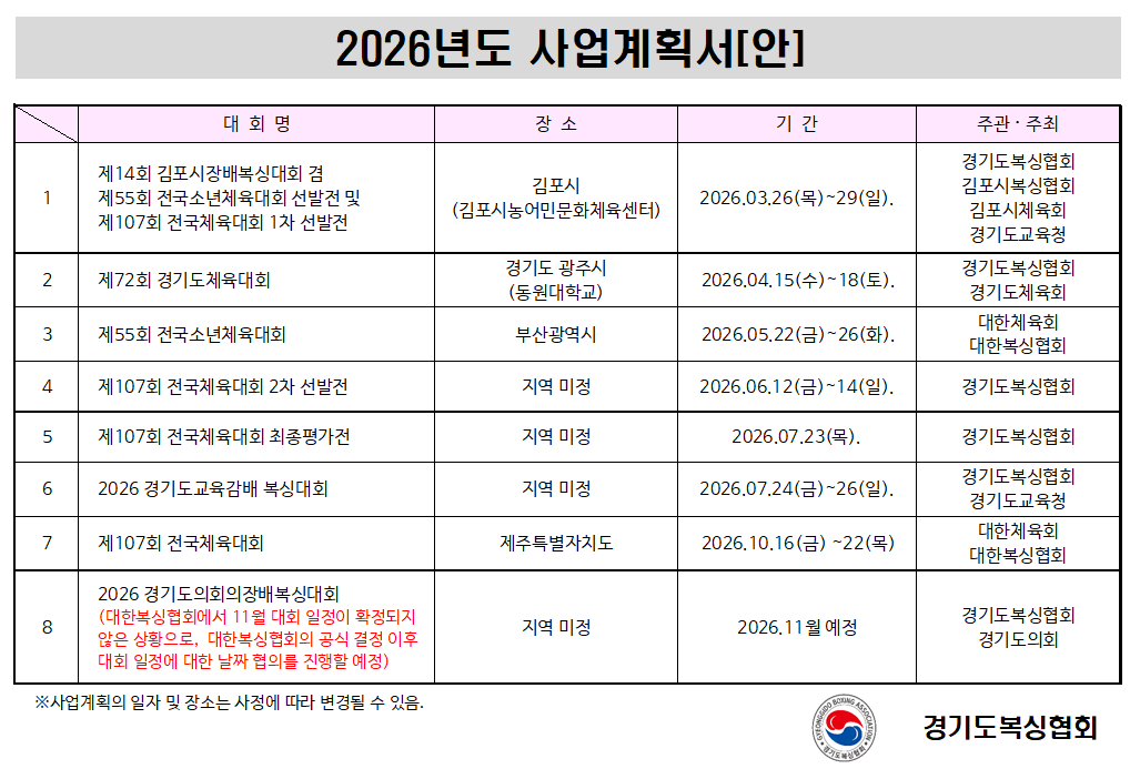 2026년도 경기도복싱협회 사업계획서(기준일: 2025.02.10.) 작성자경기도복싱협회|작성시간26.02.03|조회수603 목록 댓글 0 글자크기 작게가 글자크기 크게가 (2026 경기도복싱협회) 사업계획서.pdf81.75KB 첨부파일첨부된 파일이 2개 있습니다. png 파일 image.png 다운로드 pdf 파일 (2026 경기도복싱협회) 사업계획서.pdf 다운로드 다음검색 현재 게시글 추가 기능 열기 북마크 공유하기 신고 센터로 신고 댓글 댓글 0 댓글쓰기 답글쓰기 댓글 리스트