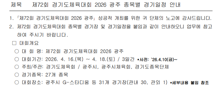 제72회 경기도체육대회 2026 광주 종목별 경기일정 안내 작성자경기도복싱협회|작성시간26.02.12|조회수312 목록 댓글 0 글자크기 작게가 글자크기 크게가 붙임자료 확인바랍니다. 경기도복싱협회 제72회 경기도체육대회 종목별 경기장 및 경기일정(260212).hwp63.00KB 첨부파일첨부된 파일이 2개 있습니다. png 파일 image.png 다운로드 hwp 파일 제72회 경기도체육대회 종목별 경기장 및 경기일정(260212).hwp 다운로드 다음검색 현재 게시글 추가 기능 열기 북마크 공유하기 신고 센터로 신고 댓글 댓글 0 댓글쓰기 답글쓰기 댓글 리스트