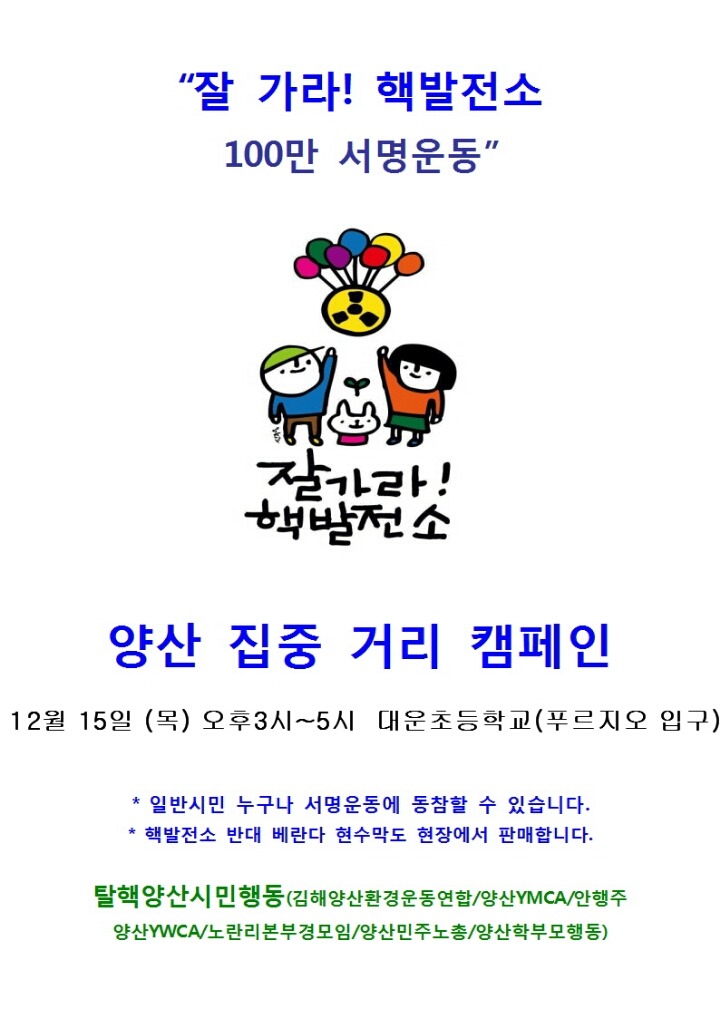 12월 15일 양산 목탈핵 서명전 안내입니다~^^ 작성자아카젠키|작성시간16.12.12|조회수58 목록 댓글 0 글자크기 작게가 글자크기 크게가 이번 주 양산 목탈핵 서명전입니다~!동양산에서 서명전 있으니 많은 참여 바랍니다~^^ 다음검색 현재 게시글 추가 기능 열기 북마크 공유하기 신고 센터로 신고 댓글 댓글 0 댓글쓰기 답글쓰기 댓글 리스트