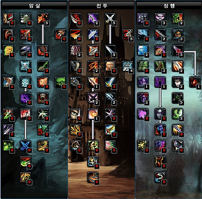 은신 - 매복(주무기 단검, 보조 도검) - [아드레날린 촉진] - [회피] - 무기 스왑(주무기 맥뎀 높은 도검, 보조 단검) - 과다출혈과 사악한 일격 - 급소 가격 - [폭풍의 칼날] - 과다출혈 - 사악한 일격 - [실명] 또는 [후려치기] - 과다출혈 - 사악한 일격으로 공격합니다.