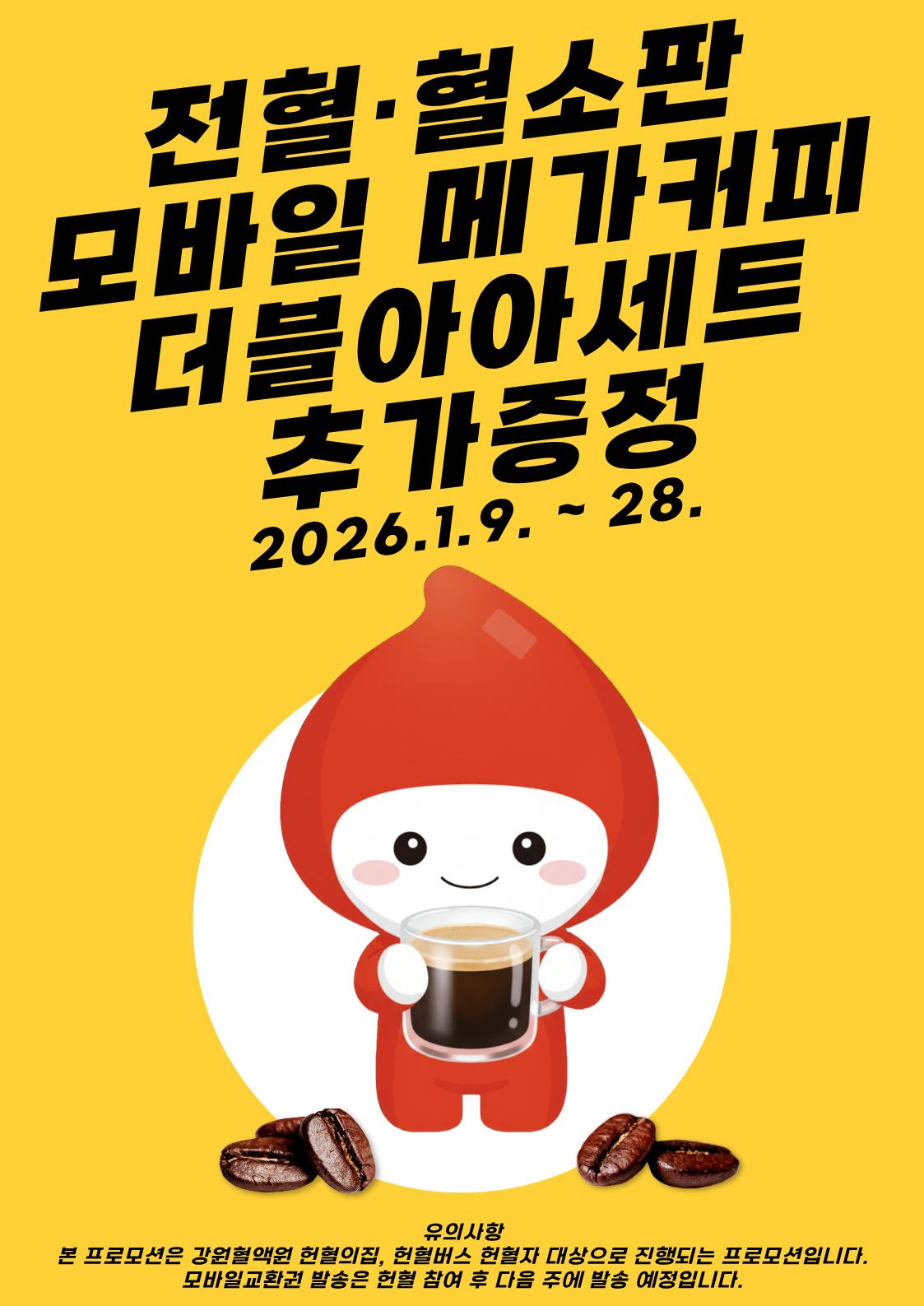 [죵료]강원에서 헌혈하고 메가커피 모바일 더블아아세트 받자! (2026.01.09 ~ 2026.01.28) 작성자방울헌혈봉사회 나준선(90회)|작성시간26.01.09|조회수7 목록 댓글 0 글자크기 작게가 글자크기 크게가 다음검색 현재 게시글 추가 기능 열기 북마크 공유하기 신고 센터로 신고 댓글 댓글 0 댓글쓰기 답글쓰기 댓글 리스트