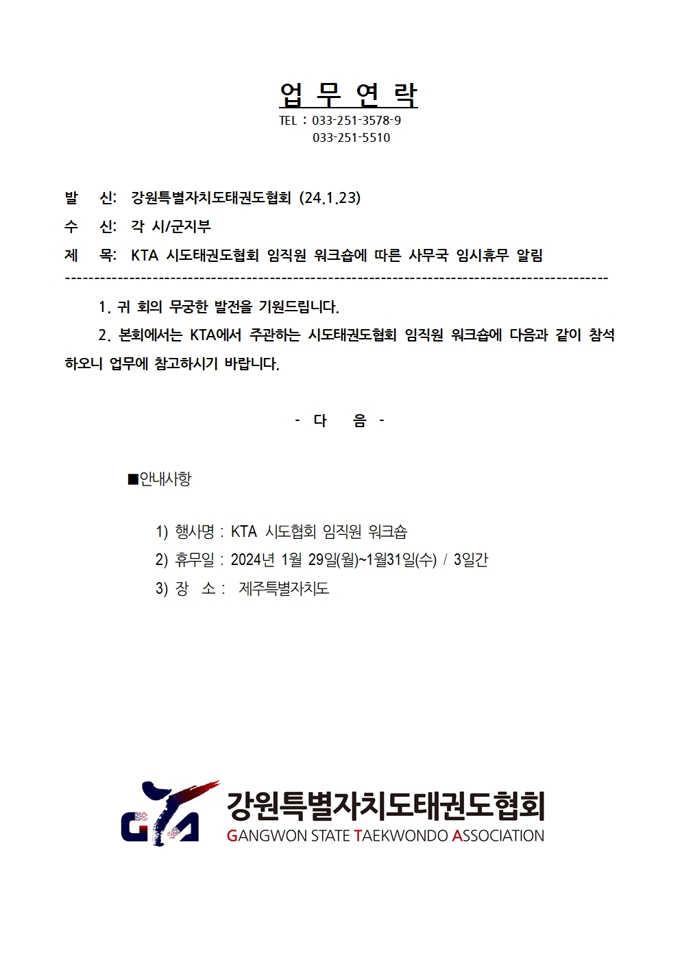 KTA 시도태권도협회 임직원 워크숍에 따른 사무국 임시휴무 알림 작성자강원태권|작성시간24.01.23|조회수188 목록 댓글 0 글자크기 작게가 글자크기 크게가 다음검색 현재 게시글 추가 기능 열기 북마크 공유하기 신고 센터로 신고 댓글 댓글 0 댓글쓰기 답글쓰기 댓글 리스트