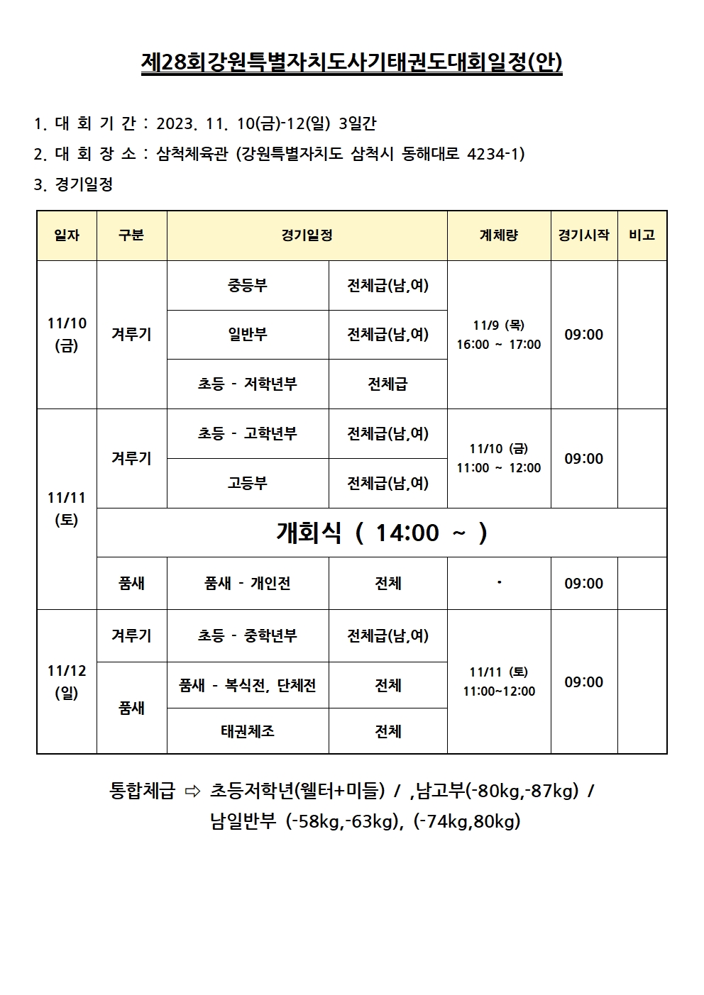 제 28회 강원특별자치도지사기 태권도대회 경기일정 변경 알림 작성자강원태권|작성시간23.10.30|조회수1,698 목록 댓글 0 글자크기 작게가 글자크기 크게가 다음검색 현재 게시글 추가 기능 열기 북마크 공유하기 신고 센터로 신고 댓글 댓글 0 댓글쓰기 답글쓰기 댓글 리스트