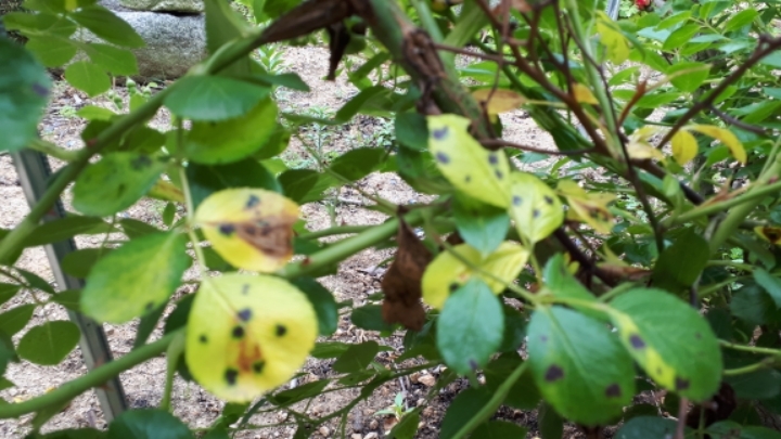 원인은 흙에 있던 병균이 관수나 빗물에 의해 장미잎에 튀면서 발병하고요.