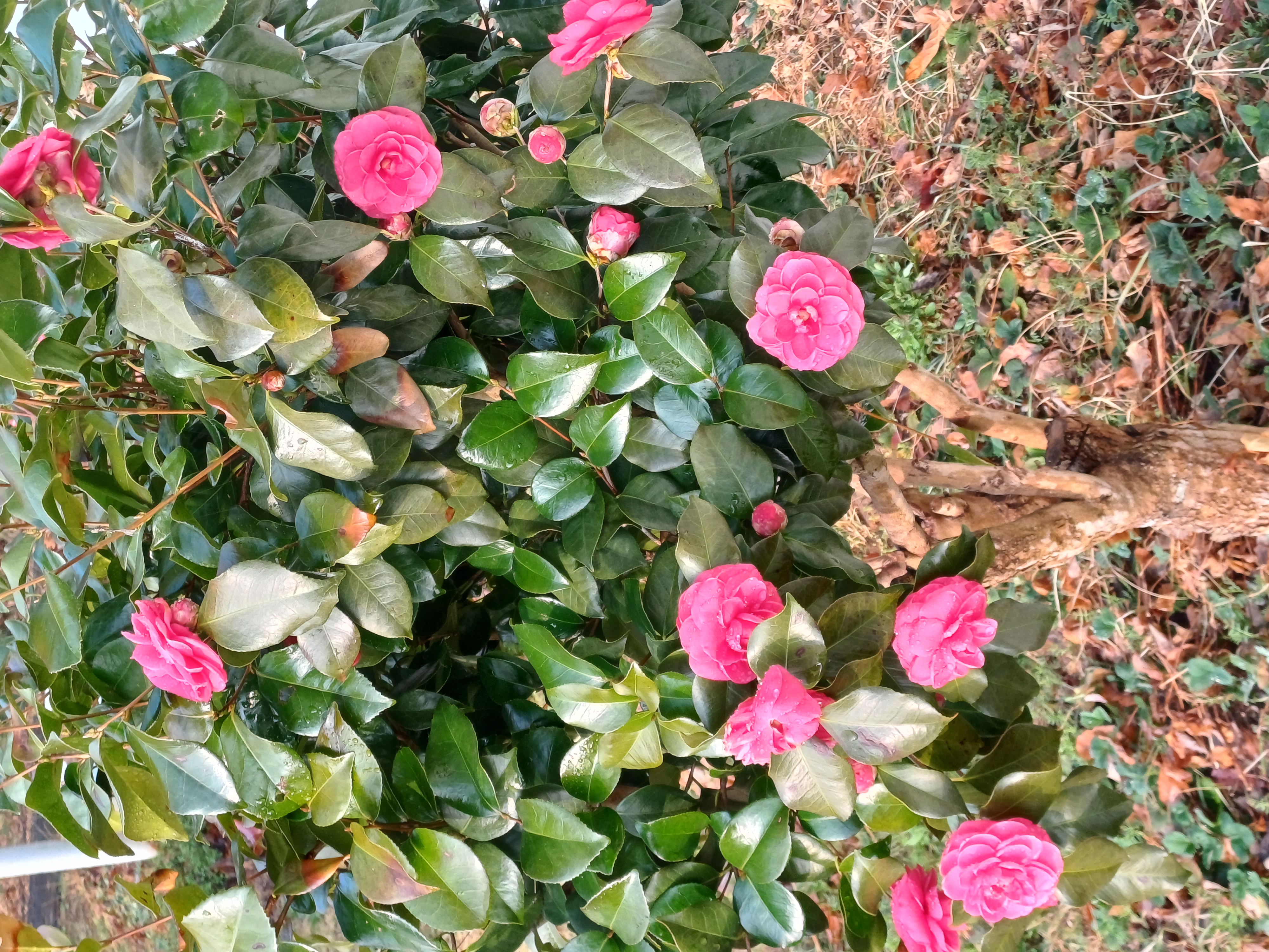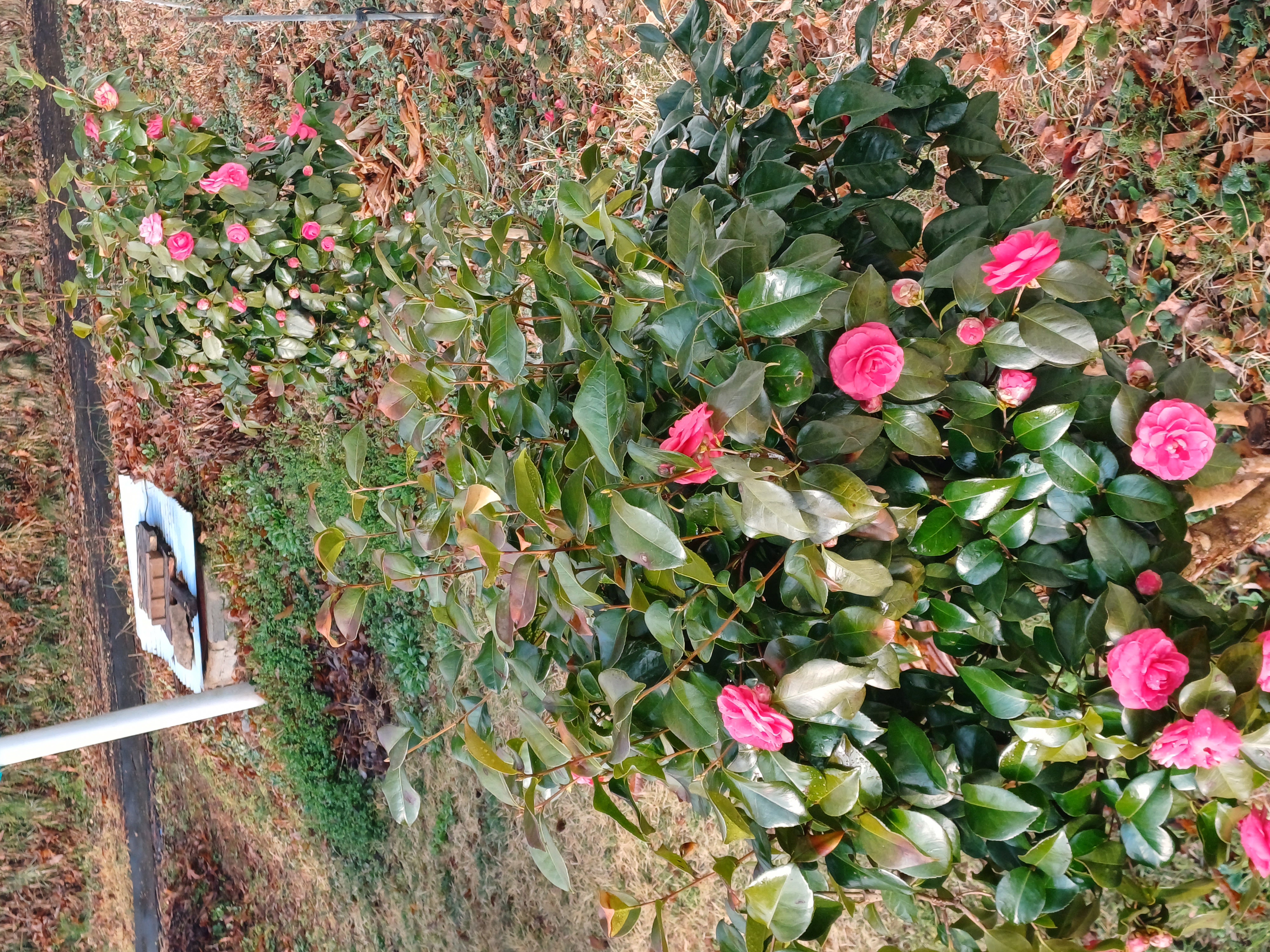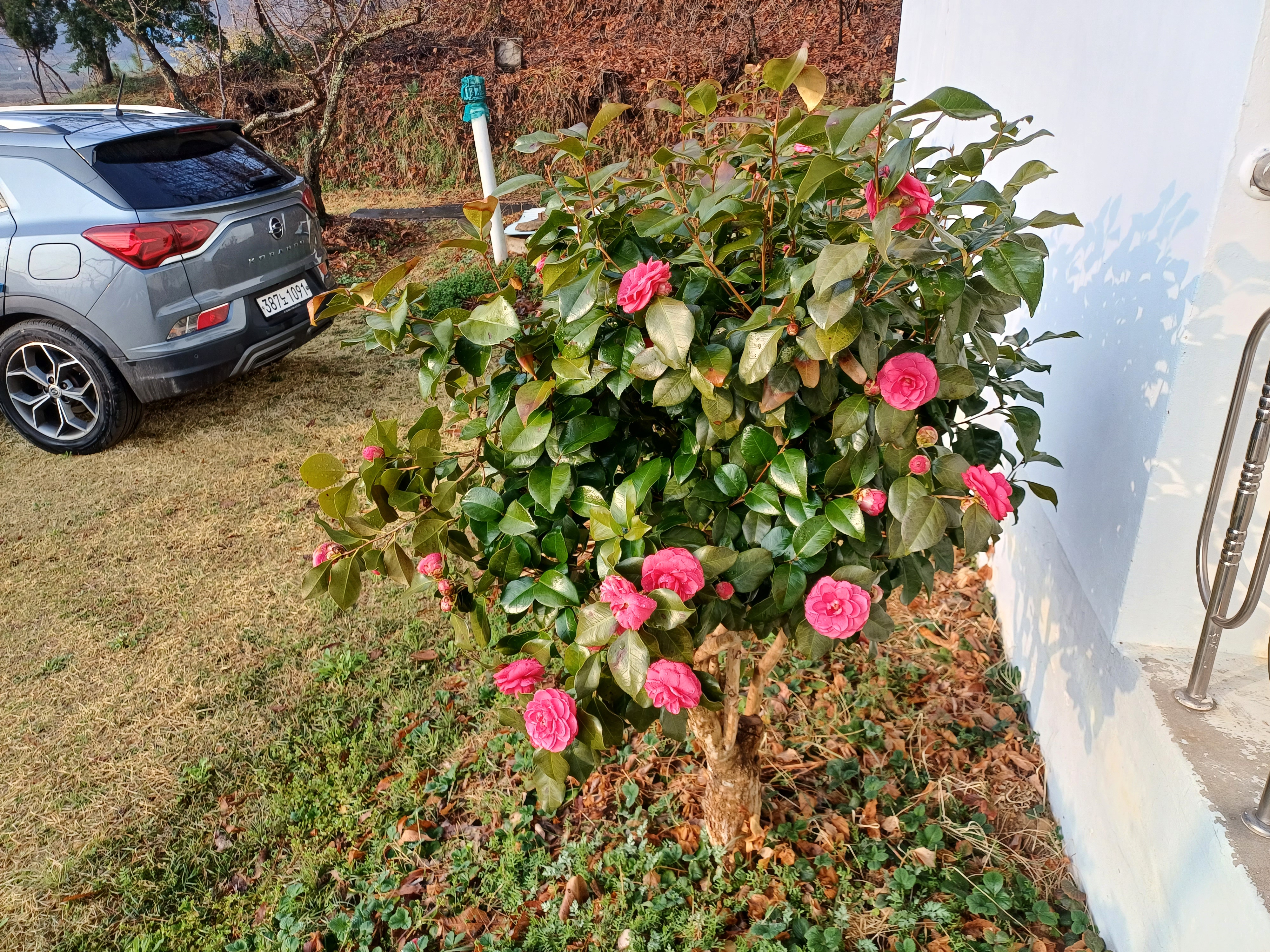 집앞에 있는 화단에 동백 두 그루 스산 겨울을 이겨내고 꽃을 피웁니다^^