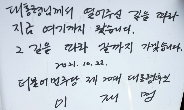 여기에서 강조하는 것은 그 사람의 마음의 중심에 의지(意志)와 의도(意圖)가 그 사람에 영원을 좌우하는 것입니다. 이같은 영적인 원리로 북괴 간첩 노무현이 열어주신 길을 따라 여기까지 왔습니다. 그 길을 따라 끝까지 가겠습니다. 라는 말은 대한민국을 반역하고 북괴 공산화 혁명을 위하여 이재명의 몸을 다 바치겠다는 영적인 의미입니다.