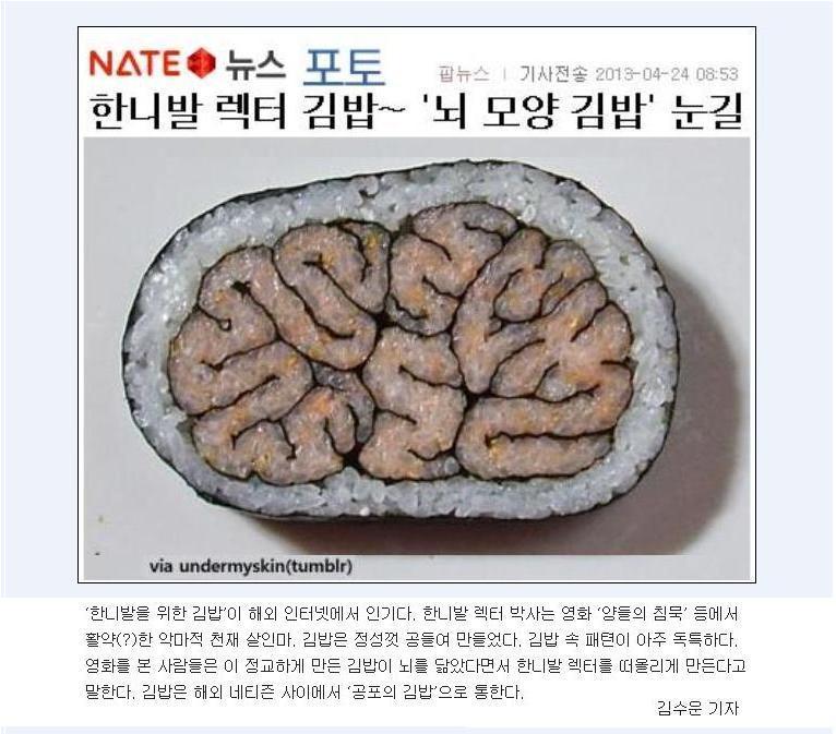 한니발 렉터 김밥~ '뇌 모양 김밥' 눈길-2013년-04월25일 작성자반달곰 팬다곰|작성시간13.04.25|조회수16 목록 댓글 0 글자크기 작게가 글자크기 크게가 한니발 렉터 김밥~ '뇌 모양 김밥' 눈길- 2013년-04월24일.JPG 다음검색 현재 게시글 추가 기능 열기 북마크 공유하기 신고 센터로 신고 댓글 댓글 0 댓글쓰기 답글쓰기 댓글 리스트