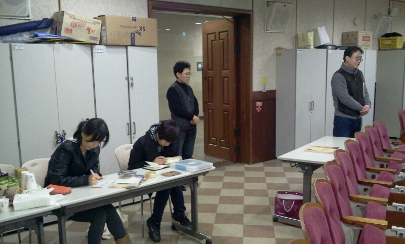 열심히 살롬찬양대를 섬기는 대장집사님과 임원들이 뒤편에서 열심히 대원들에게 도우미역활을 행하시고 지금은 마침기도에 정성을 다하여 동참하고 있는 모습입니다. (섬겨주심에 감사합니다.)