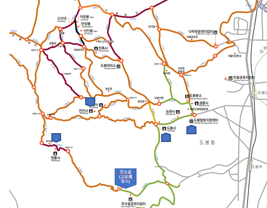 - (둘레길 코스 2번) 무수골 > 도봉탐방지원센터 (2km, 1시간 소요)