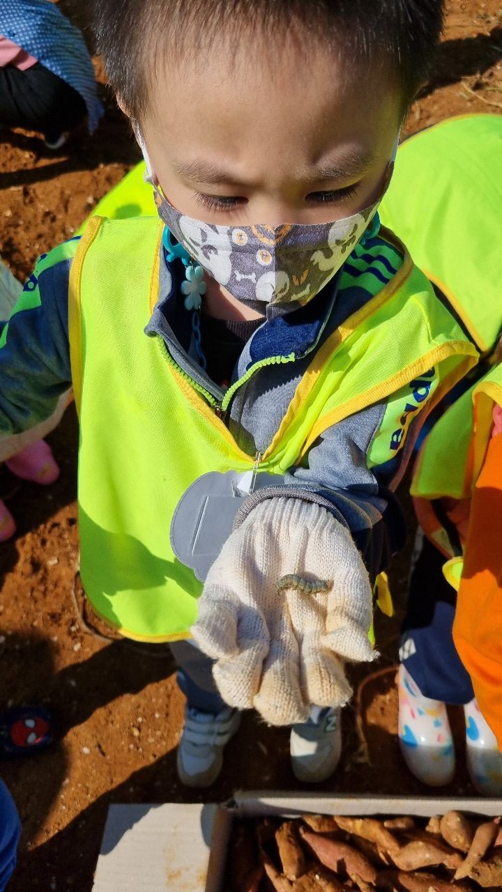 그러고는 또 고구마 캐기에 집중하려는데 "얘들아~~ 애벌레야. 애벌레!!!" 하는 외침에 또 우르르 몰려가 애벌레 관찰에 심취^^